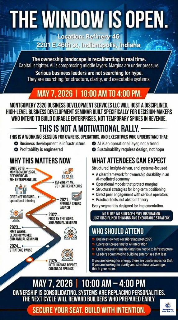 On May 7, 2026 | 10:00 AM – 4:00 PM at Refinery 46 in Indianapolis, Indiana, Montgomery 2320 will host a high-level Business Development Seminar built exclusively for decision-makers who intend to engineer resilient enterprises, not chase temporary revenue spikes.